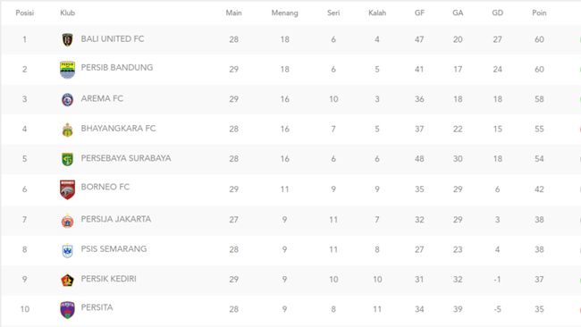 Di posisi ketiga ada Arema dengan 58 poin, Bhayangkara FC di peringkat keempat dengan 55 poin, dan Persebaya Surabaya ada di urutan kelima dengan 54 poin.