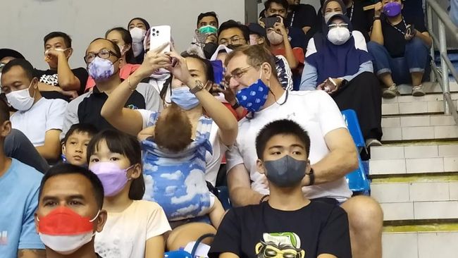 Menyaksikan pertandingan basket, Robert tampak humble menyapa orang-orang. Ia terlihat antusias berada di tribun penonton menyaksikan Yudha Saputera cs bertanding.