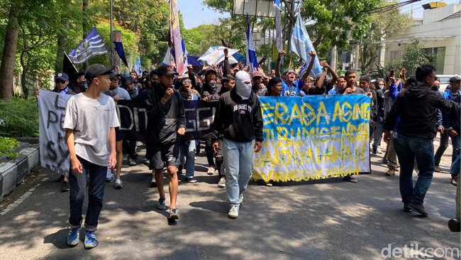 Massa Bobotoh longmarch dari Lapang Saparua menuju Kantor PT Persib Bandung Bermartabat (PBB) yang berada di Jalan Sulanjana, Kota Bandung. Mereka akan melakukan aksi protes terkait sistem tiketing laga Persib Bandung.