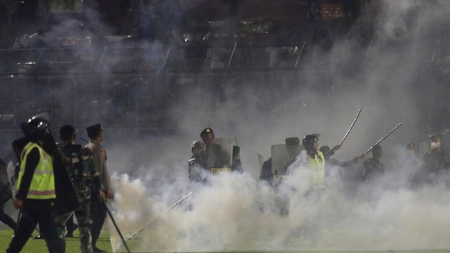 Aparat keamanan kemudian membubarkan kerumunan suporter, salah satunya dengan menembakkan gas air mata. Lantaran menghindari gas air mata, suporter berebut hingga akhirnya berdesak-desakan keluar stadion