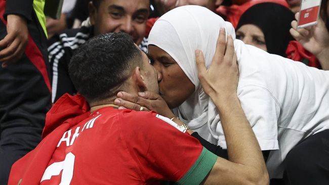 Dikutip dari detikSport, ada pemandangan menarik setelah Achraf Hakimi mencetak gol penalti penentu kemenangan Maroko. Bintang Paris Saint-Germain itu berlari ke arah tribun dan memeluk perempuan paruh baya yang memakai hijab.