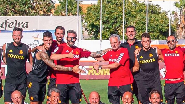 Jose Mourninho memberikan kode di tayangan sosial medianya. Kali ini, ia merangkul pemain 'gaib' saat berfoto dengan pemain dan staf AS Roma di Portugal.
