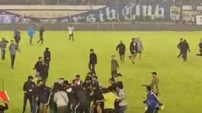 Bahkan, saking banyaknya penonton yang masuk ke lapangan, pagar pembatas ikut ambruk. Polisi langsung bertindak dengan memukul mundur penonton.