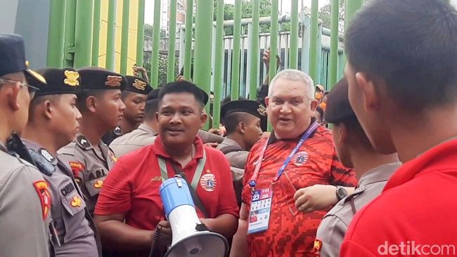 Mantan ketua Umum The Jakmania Ferry Indrasjarief sempat turun ke gerbang untuk menenangkan para suporter tanpa tiket yang meminta masuk tersebut.