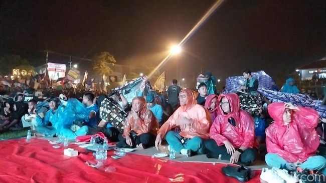 Meski rintik hujan terus mengguyur area nobar, Eman tetap berdiri di tengah kerumunan warga, mengenakan jas hujan dan syal. Ia tampak antusias mengikuti jalannya pertandingan.