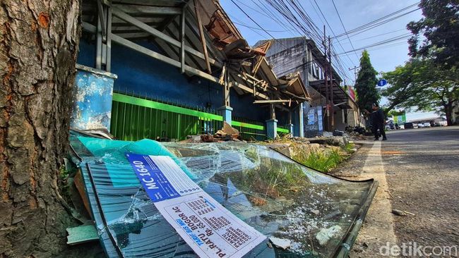 Puing-puing bata merah, genteng, kayu, hingga potongan seng berserakan di halaman depan bangunan yang bercat biru dengan pagar hijau terang. Beberapa tiang penyangga tampak miring, menunjukkan bahwa struktur atap telah kehilangan daya topang.