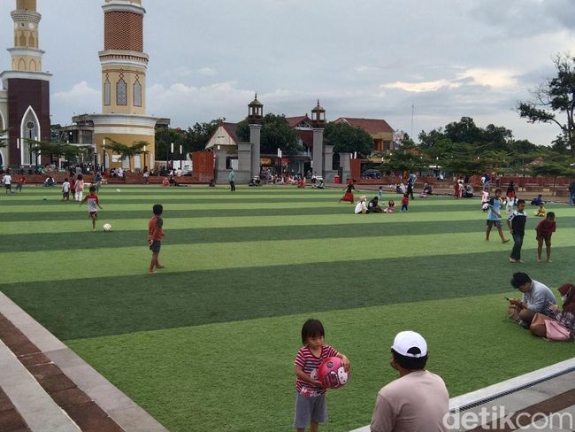 Berbagai macam aktivitas masyarakat terlihat di sana. Ada yang asyik berswafoto, sekadar mengobrol, bahkan bermain bola di rumput sintetis.