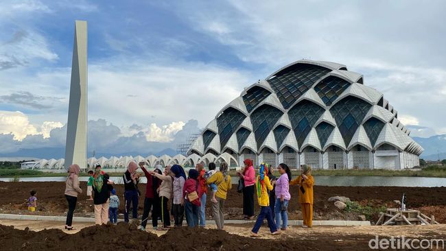 Berwisata ke kawasan Masjid Al-Jabbar sedang ramai dilakukan warga. Meski pembangunan masjid ini belum rampung 10 persen, pemandangan bangunan masjid yang desain Gubernur Jawa Barat Ridwan Kamil ini menjadi spot favorit para pengunjung untuk berswafoto.
