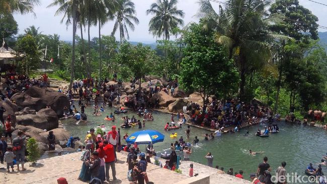 Sebelum memasuki gerbang masuk wisata, detikers akan di sambut dengan jajanan dan oleh-oleh, ada juga yang berjualan fasilitas penunjang untuk berenang di dalam wisata air ini.