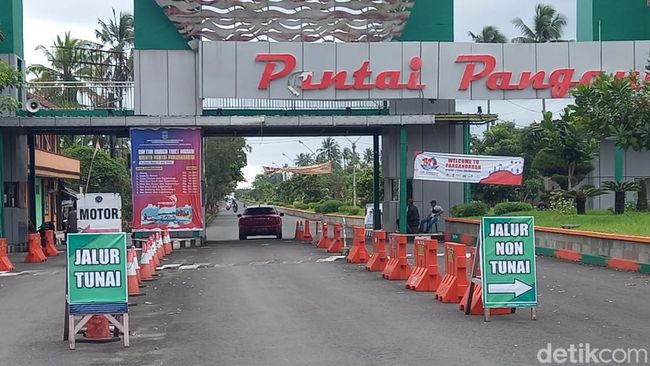 Pantauan detikJabar pada Rabu (12/10) sore pukul 16.30 WIB di pintu masuk objek wisata pantai Pangandaran. Wisatawan masih ada yang memasuki objek wisata.