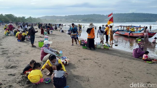 Pantauan detikJabar, para pedagang yang tumplek di pesisir pantai terlihat menghalangi suasana wisatawan. Mereka menjajakan berbagai jenis dagangan diantaranya pecel, sosis, cuanki, kopi dan mainan anak.