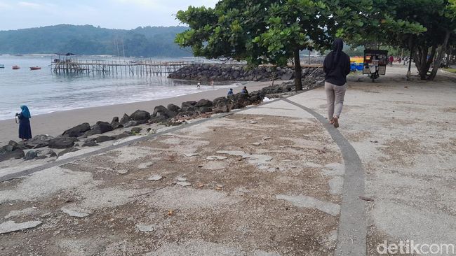 Pantauan detikJabar pada Minggu (12/2) pagi sepanjang pedestrian di pantai timur sudah mulai tergerus, batuan kecil yang menjadi alas dan ikonik di jalan itu berhamburan seperti pasir.