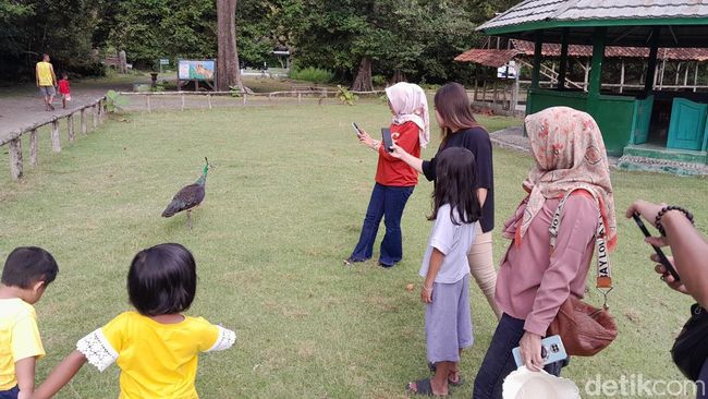 Sementara itu wisatawan lainnya, Eka membawa putrinya menyaksikan merak dan berswafoto.