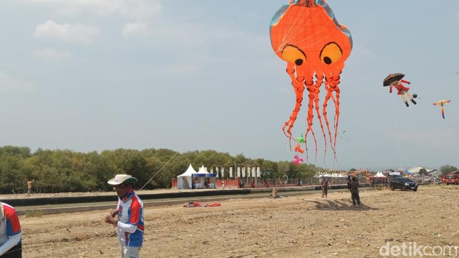 Dari sekian banyaknya karakter layang-layang yang diterbangkan, salah satunya adalah layang-layang berbentuk octopus atau gurita. Layang-layang berukuran 25 meter itu merupakan milik peserta asal Jakarta, Mirna Indriasari.