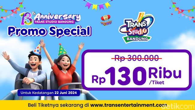 Selain itu, untuk merayakan ulang tahun ke-13 ini, Trans Studio Bandung menawarkan harga tiket spesial sebesar Rp130.000 untuk pengunjung yang datang pada tanggal 22 Juni 2024.