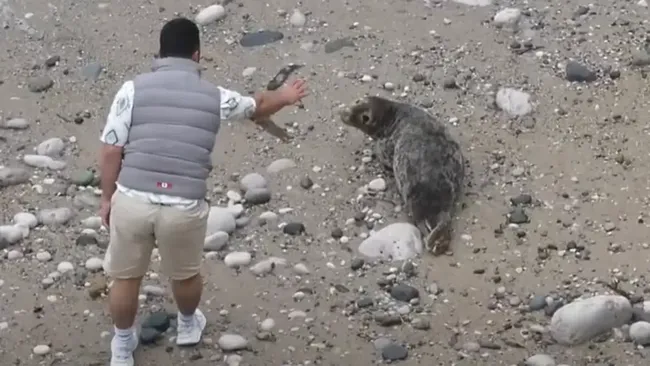 Dalam video tersebut, Cox terdengar berteriak ke arah pantai agar pria tersebut meninggalkan anjing laut abu-abu itu, tetapi dia terus berjalan ke arahnya.
