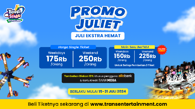 Saat ini sedang ada promo "JULIET, Juli EkstraHemat" dari Trans Studio Bandung yang menghadirkan berbagai wahana seru untuk menghabiskan waktu bersama orang terdekat dengan harga hemat.