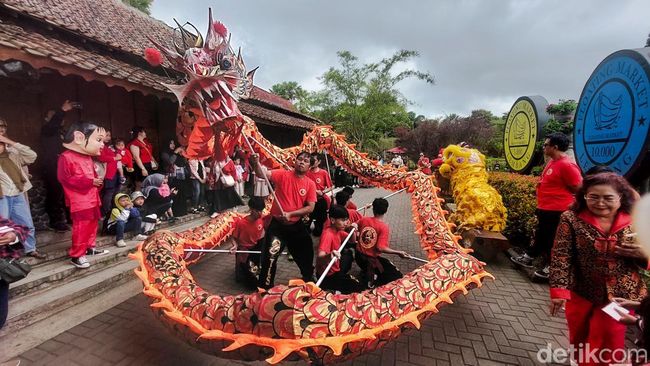 Wisatawan yang datang ke objek wisata Floating Market Lembang, Kabupaten Bandung Barat (KBB) terpukau dengan atraksi barongsai dan naga liong pada momen Imlek 2025.