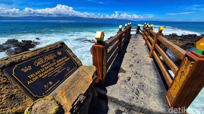 Sebuah jembatan beton lengkung bertuliskan 'Alor Mandung' dalam aksara kekuningan kini berdiri kokoh di atas gugusan karang alami kawasan Pantai Karang Hawu, Cisolok, Kabupaten Sukabumi. Jembatan ini dibangun peziarah yang disebut berasal dari Sidoarjo, Jawa Timur.
