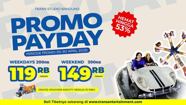 Sedang mencari destinasi liburan keluarga yang seru, nyaman, dan ramah di kantong? Trans Studio Bandung jawabannya! Kini ada Promo Payday spesial yang sayang banget kalau kamu lewatkan. Harga tiket masuk yang biasanya Rp 200.000 untuk weekdays dan Rp 300.000 untuk weekend, kini jadi jauh lebih hemat.