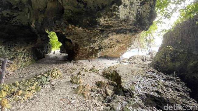 Sepintas Goa Panggung Pangandaran terlihat seperti lubang karang yang terbelah dua. detikJabar menjajal suasana dalam Goa Panggung. Di dalamnya, ada 10 anak tangga yang menuntun menuju makam Embah Jaga Lautan. Aroma mistis langsung menyambar tubuh kala masuk ke dalam goa.
