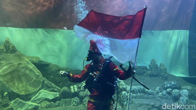 Setelah itu, empat penyelam melaksanakan pengibaran bendera dalam aquarium dengan luas 33 meter. Ada satu hal yang menarik banyak perhatian pengunjung yaitu pertunjukan mermaid yang melewati bentangan bendera Merah Putih.