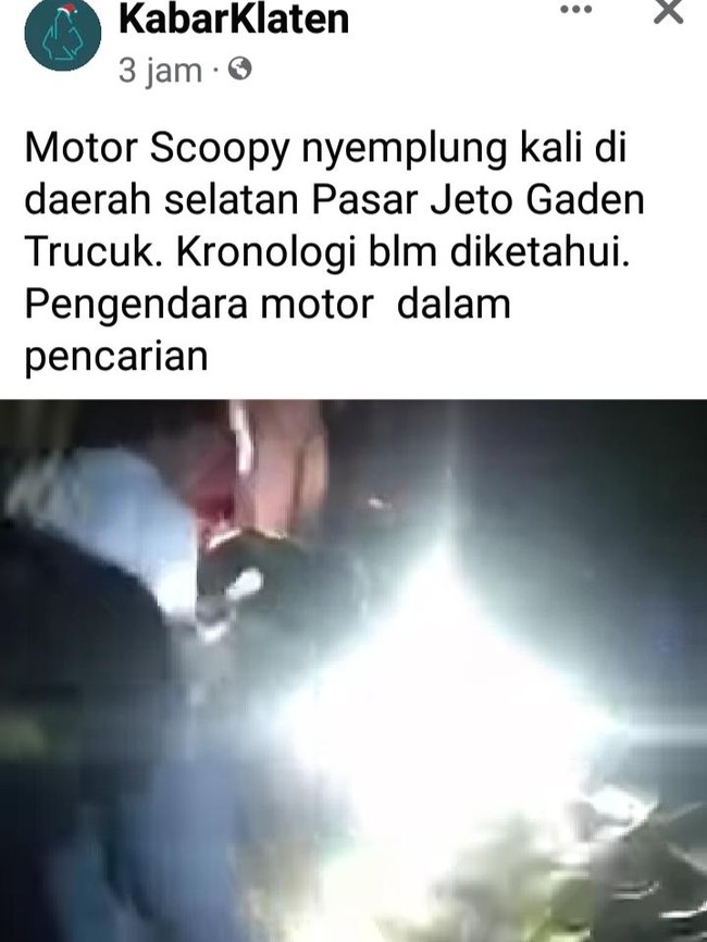 Informasi kecelakaan air itu viral di media sosial. Di grup Facebook Kabarklaten, kejadian itu diunggah pukul 01.00 WIB. "Motor Scoopy nyemplung kali di daerah selatan Pasar Jeto Gaden Trucuk. Kronologi blm diketahui. Pengendara motor dalam pencarian," tulis admin grup.