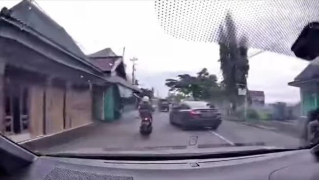 Mobil sedan langsung menepi ke sisi kiri. Pemotor lainnya kemudian terlihat berhenti setelah kejadian tersebut.