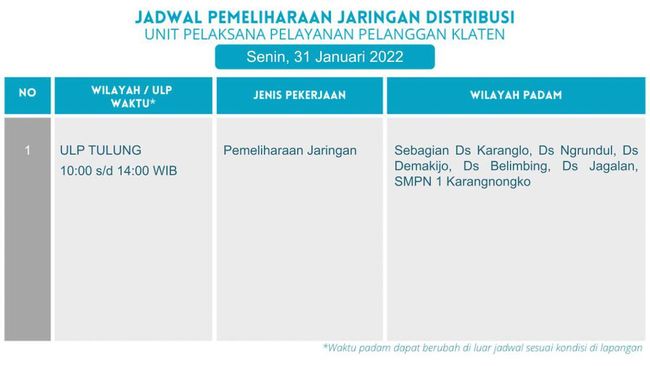 "Rencana pemadaman ini dalam rangka kegiatan pemeliharaan jaringan distribusi rutin. Dilaksanakan ULP Tulung," kata Manajer Jaringan PT PLN UP3 Klaten Mulki Maulana kepada detikJateng, Senin (31/1/2022) pagi.