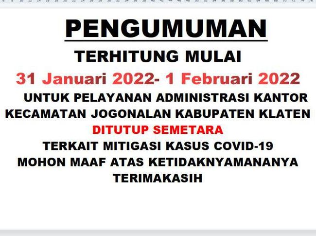 PENGUMUMAN, TERHITUNG MULAI 31 Januari 2022-1 Februari 2022 UNTUK PELAYANAN ADMINISTRASI KANTOR KECAMATAN JOGONALAN KABUPATEN KLATEN DITUTUP SEMETARA TERKAIT MITIGASI KASUS COviD-19 MOHON MAAF ATAS KETIDAKNYAMANANYA TERIMAKASIH