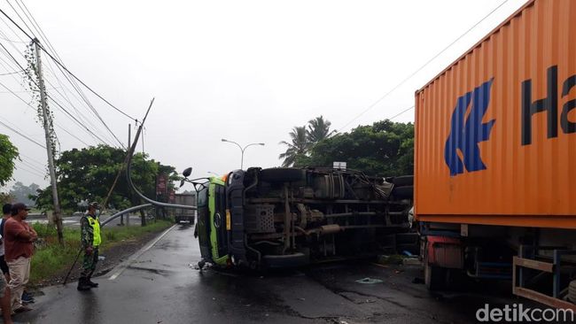Akibatnya truk boks bermuatan permen itu terguling menimpa tiang lampu penerangan jalan hingga roboh.