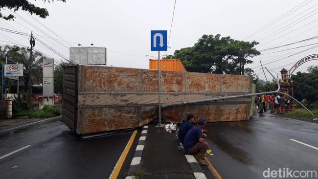 Truk tronton itu terguling dekat dengan rambu putar balik. Tampak tiang penerangan lampu jalan juga roboh di samping truk dan turut menutup ruas jalan Solo ke Semarang.