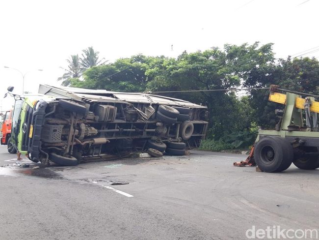 Setelah berhasil disingkirkan dari badan jalan, truk derek kemudian mengevakuasi truk tronton yang terguling.