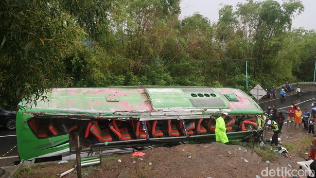 "Karena bus dari belakang itu goyang kanan kiri lagi yang belakang nabrak tebing. Bagian belakang terbang nabrak tebing," imbuh Elko.