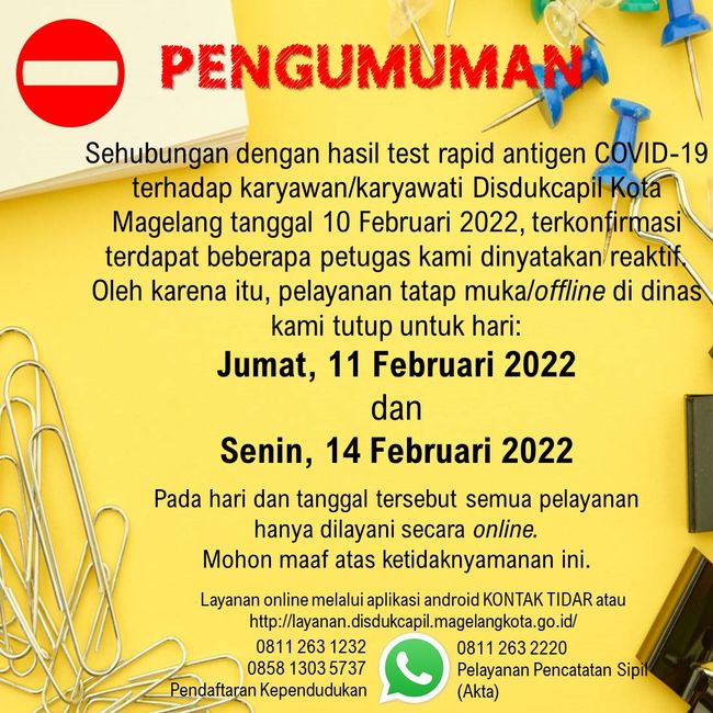 Pelayanan di kantor Dinas Kependudukan dan Pencatatan Sipil (Disdukcapil) Kota Magelang, Jateng, ditutup sementara. Penutupan dilakukan karena ada tujuh pegawai yang reaktif berdasarkan hasil swab antigen, setelah sebelumnya ada satu pegawai lebih dulu terpapar.