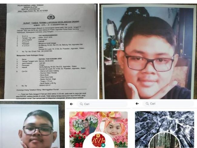 Di grup Facebook info seputar Jogonalan Klaten, kabar tersebut diunggah Jumat (11/2) sekitar pukul 10.00 WIB. "Telah meninggalkan rumah Lusah Prawatan Jogonalan sejak hari Rabu tgl 9 Pebruari 2022 , Nsma RAFAEL YUDI KUSUMA ARDI Umur 16 tahun sampai sekarang belum pulang, no hp di hubungi tidak aktif, sudah di cari kemana mana blm ketemu, terakhir pamit ibunya mau brgkt ke sekolah SMA negeri 1 Jogonalan Klaten, mohon bantuan lur apabila mengetahui bisa hub Sekretariat ISJ atau hub no wa Admin ISJ 081249044465, terimakasih," tulis akun Gunadi.