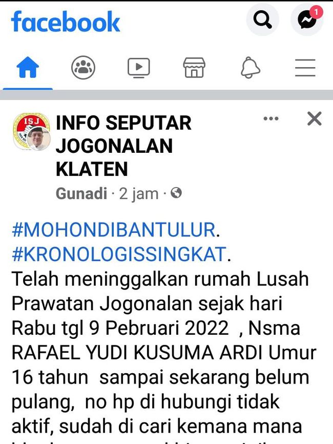 "Telah meninggalkan rumah Lusah Prawatan Jogonalan sejak hari Rabu tgl 9 Pebruari 2022 , Nsma RAFAEL YUDI KUSUMA ARDI Umur 16 tahun sampai sekarang belum pulang, no hp di hubungi tidak aktif, sudah di cari kemana mana blm ketemu, terakhir pamit ibunya mau brgkt ke sekolah SMA negeri 1 Jogonalan Klaten, mohon bantuan lur apabila mengetahui bisa hub Sekretariat ISJ atau hub no wa Admin ISJ 081249044465, terimakasih," tulis akun Gunadi.