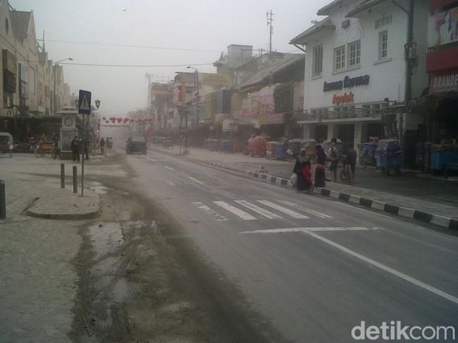 Malioboro sempat disemprot air dengan mobil water canon, namun jalanan langsung tertutup abu kembali. Hanya sedikit wisatawan yang beraktivitas di luar.