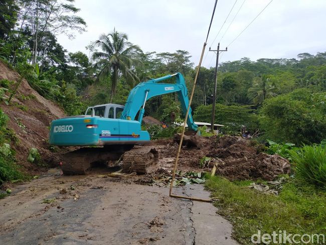 Petugas saat ini sedang membersihkan material longsor yang menutup badan jalan. Alat berat diterjunkan ke lokasi kejadian.