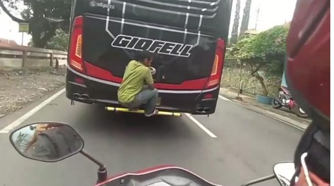 Video yang merekam seorang laki-laki yang bergelantungan di belakang bus yang melaju viral di media sosial. Video itu direkam di kawasan jalur Bandungan-Sumowono, Kabupaten Semarang.