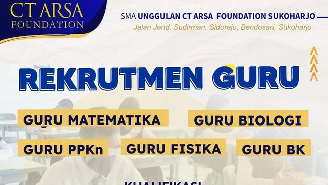 SMA Unggulan CT Arsa Foundation Sukoharjo membuka sejumlah lowongan guru. Sedulur yang berminat monggo simak syaratnya.