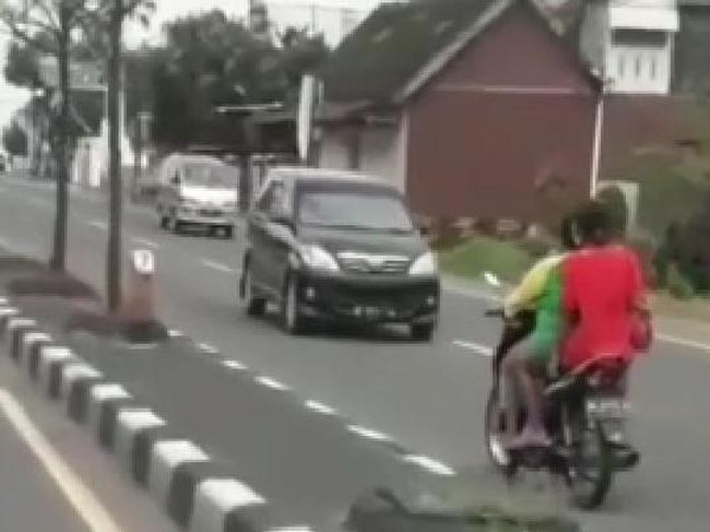 Pada rekaman video terlihat seorang wanita paruh baya berambut panjang, memboncengkan seorang wanita. Pengendara di depan mengenakan kaus kuning hijau dan yang di belakang berkaus merah.