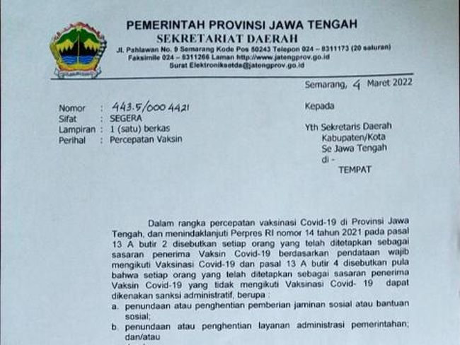 Untuk diketahui, dalam SE yang ditandatangani Sekda Provinsi Jateng, Sumarno tersebut disebutkan kewajiban mengikuti vaksinasi. Ada sanksi administratif jika tidak mengikuti vaksinasi COVID-19 yaitu: