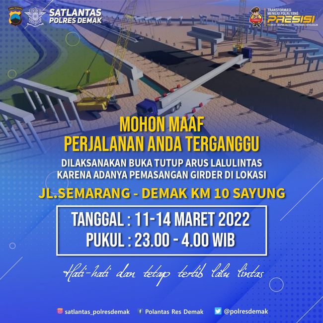 Sementara itu Sat Lantas Polres Demak melalui akun instagram resminya, @satlantas_polresdemak menginformasikan kepada para pengendara bahwa akan dilaksanakan penerapan buka-tutup jalan pada pemasangan girder tersebut. Penerapan buka-tutup jalan itu akan dilakukan di jalur pantura Semarang-Demak tepatnya di KM 10.690.