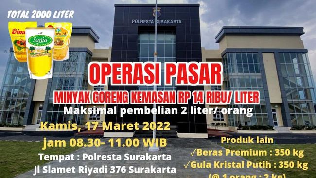 Operasi pasar ini akan digelar di Mapolresta Solo, Jalan Slamet Riyadi, Kamis (17/3/2022) mulai pukul 08.30 WIB - 11.00 WIB. Seluruh warga diperbolehkan membeli minyak goreng dalam operasi pasar ini.
