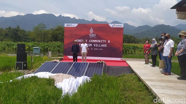 Rombongan delegasi G20 mengunjungi Balai Ekonomi Desa (Balkondes) Karangrejo, Kecamatan Borobudur, Kabupaten Magelang. Delegasi G20 ini menyaksikan peresmian pembangkit listrik tenaga surya (PLTS).