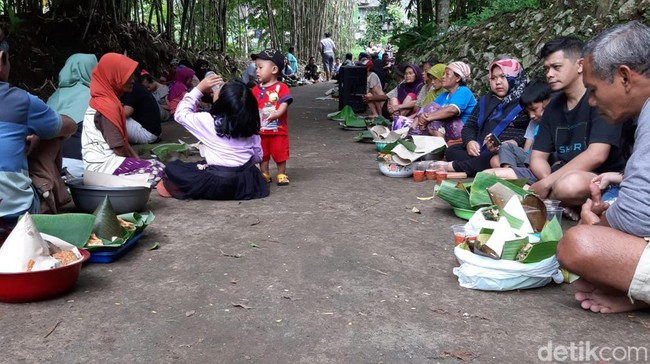 Siang harinya, mereka kembali berdatangan membawa nasi lengkap dengan lauk dan urapan. Layaknya menu kenduri di tradisi Jawa. Ada nasi gurih, gudhangan, ikan asin, ingkung ayam dan sebagainya.
