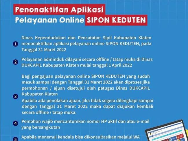 - Dinas Kependudukan dan Pencatatan Sipil Kabupaten Klaten menonaktifkan aplikasi pelayanan online SIPON KEDUTEN, pada tanggal 31 Maret 2022