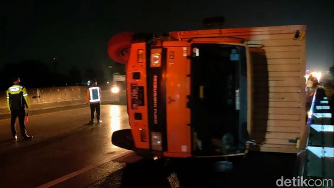 Kecelakaan tunggal terjadi di jalan tol Boyolali, Jumat malam (1/4/2022). Sebuah truk boks terguling setelah salah satu rodanya terlepas.