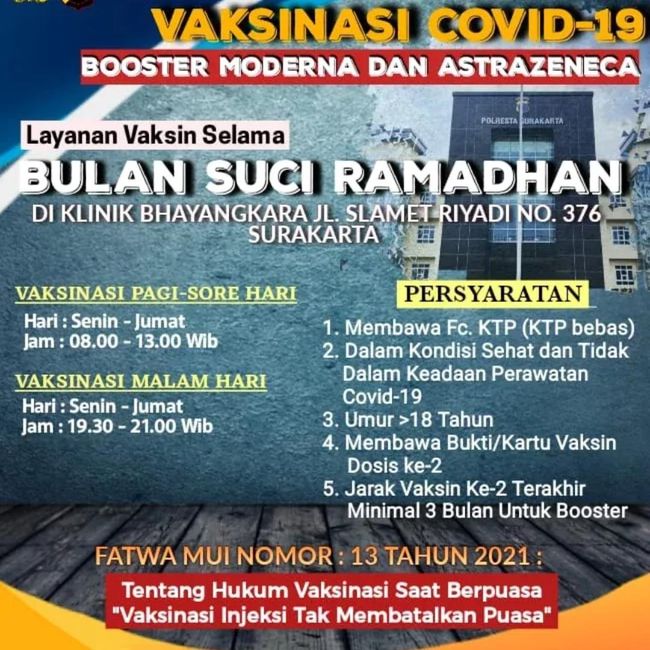 Polresta Solo menggelar vaksinasi booster malam hari selama bulan Ramadan. Pelayanan vaksin booster setiap hari Senin hingga Jumat mulai pukul 19.30-21.00 WIB.